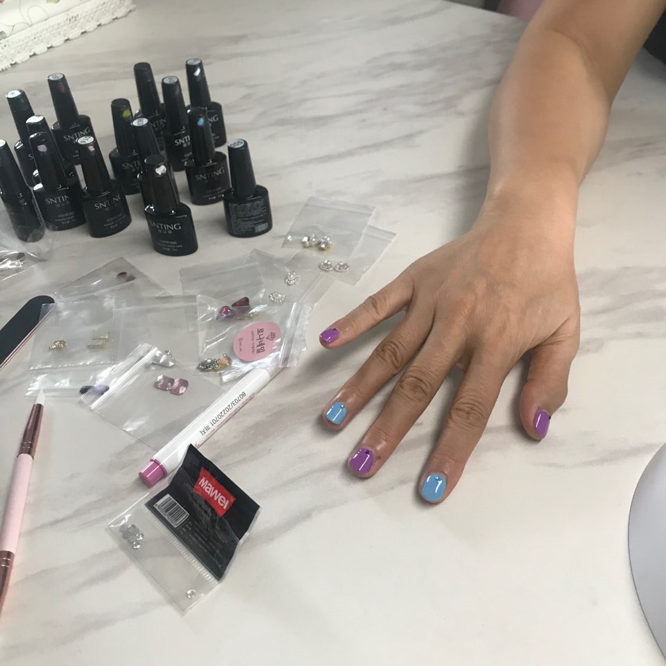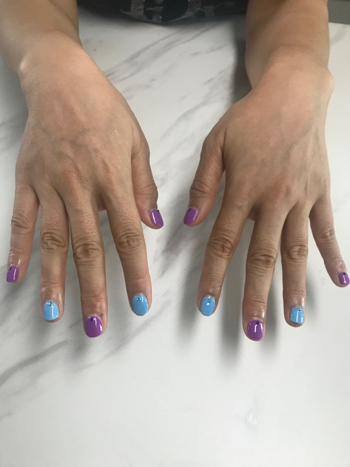 짜잔! 하늘색과 보라색을 칠하고 작은 큐빅을 박은 네일아트입니다~